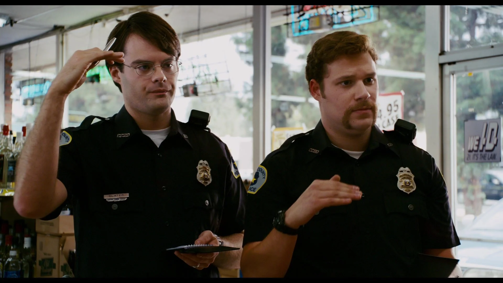 Seth and Evan return from their boob-seeking side mission to discover police inside the liquor store interrogating Fogell.