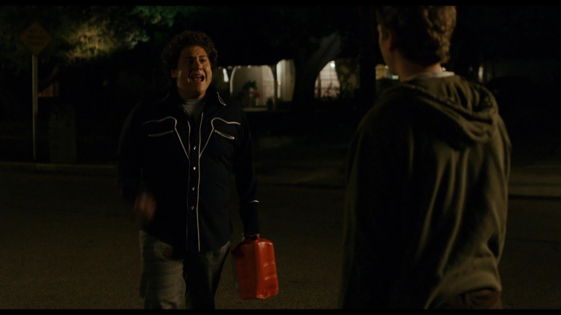 Seth and Evan begin fighting in the street, shoving one another back and forth. At the same time, Fogell and the cops get back in their cop car and continue with their night of joy rides.