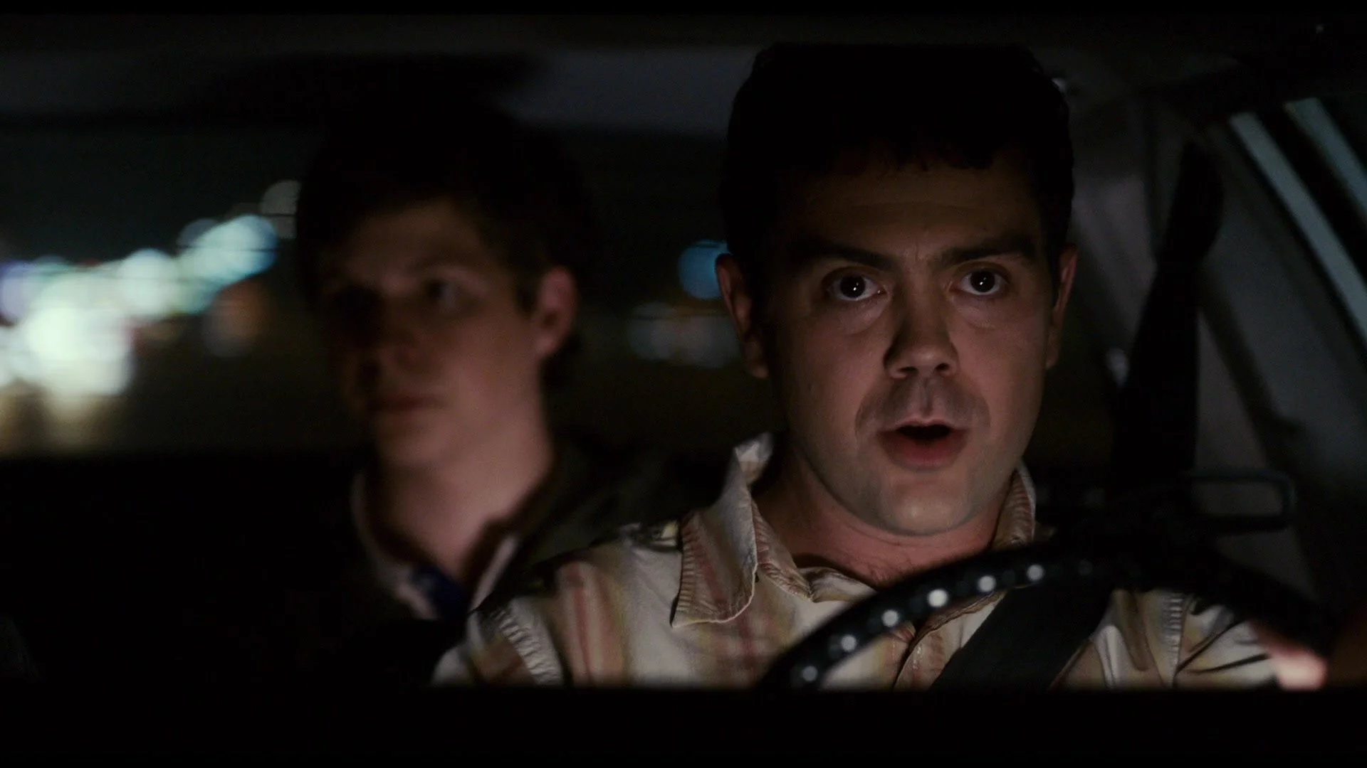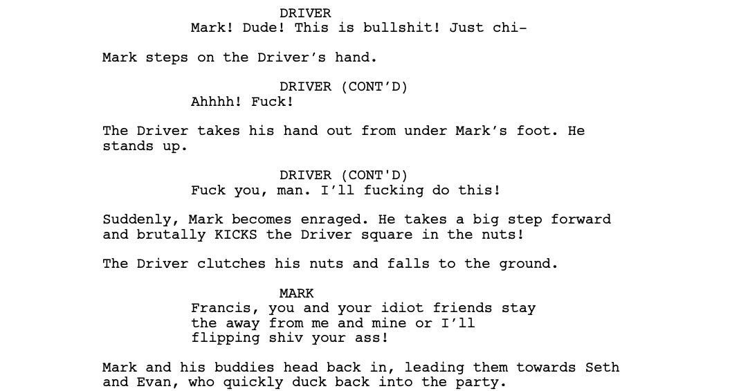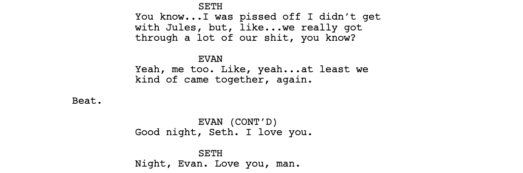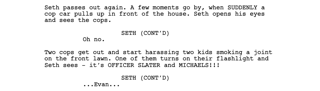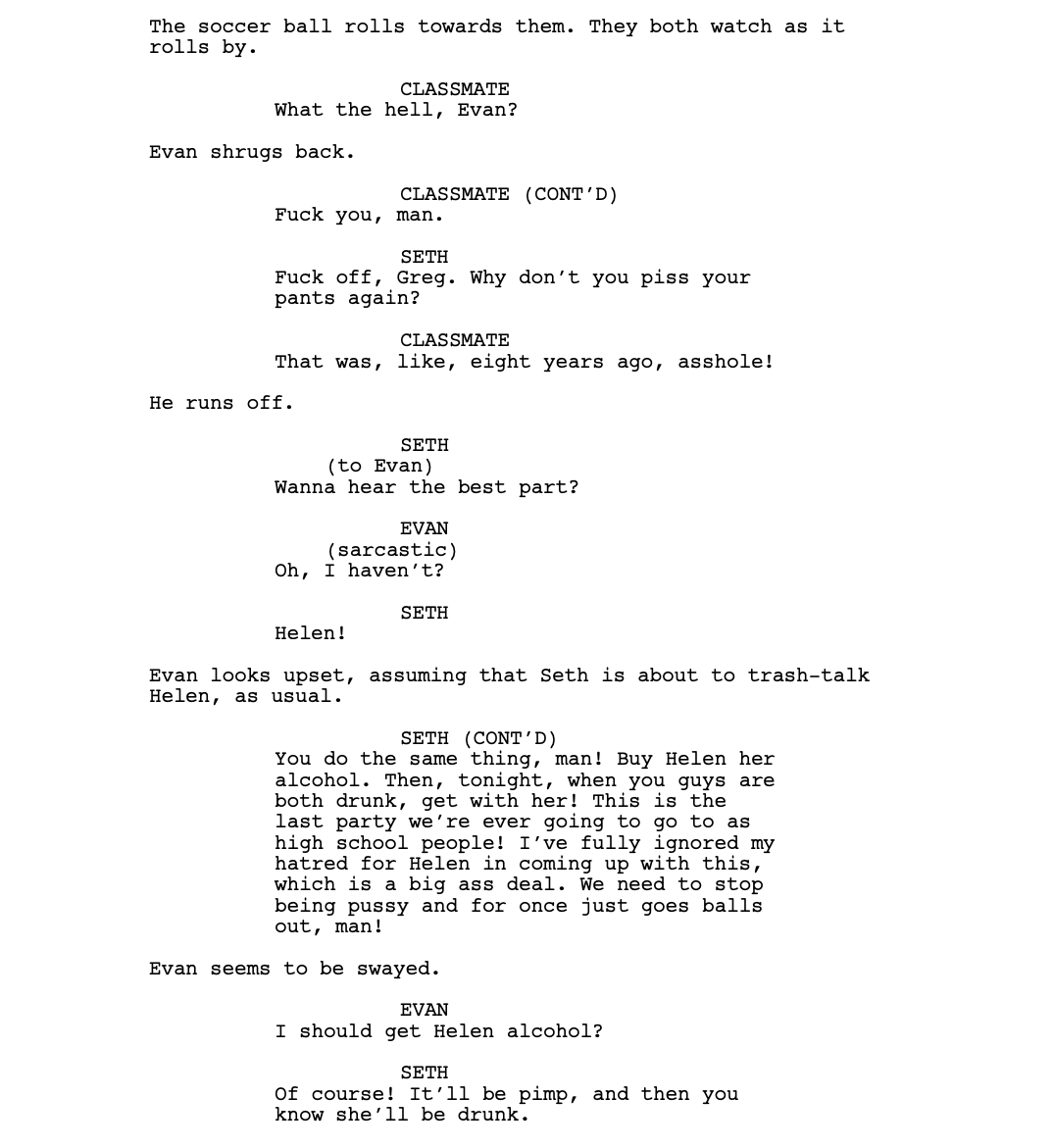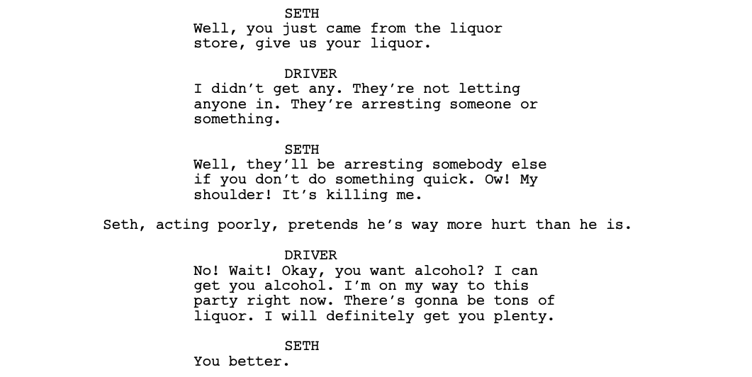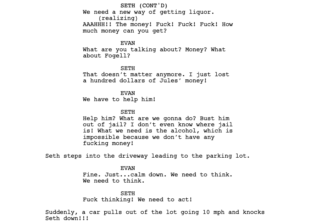 The midpoint of the script is where things really start going off the rails. First, we have Evan and Seth, who are being shuttled to an adult party by a complete stranger.