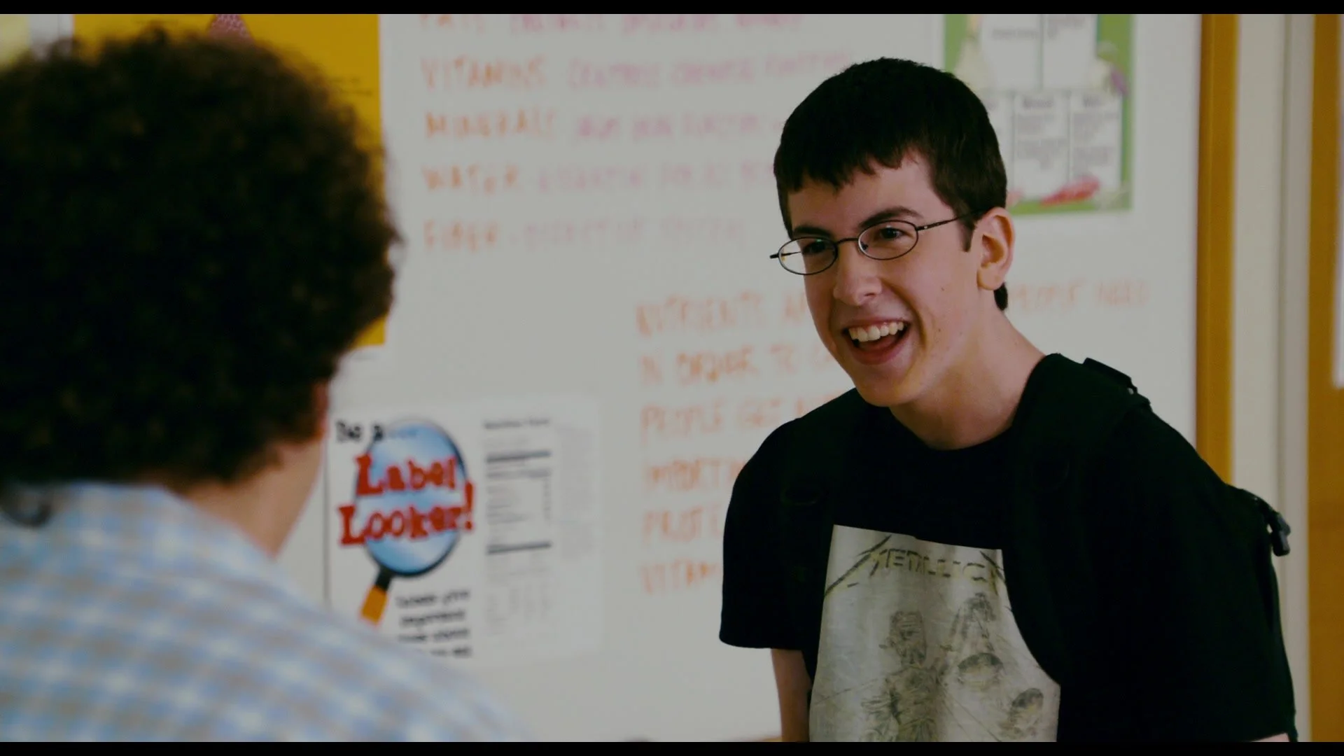 Holy shit. The hot girl he likes not only talks to him voluntarily, but she actually invites him to a party at HER house. Seth rushes over to Evan to deliver the news, which is also where we meet the unexpected star character of the film, supernerd Fogell (better known as McLovin).