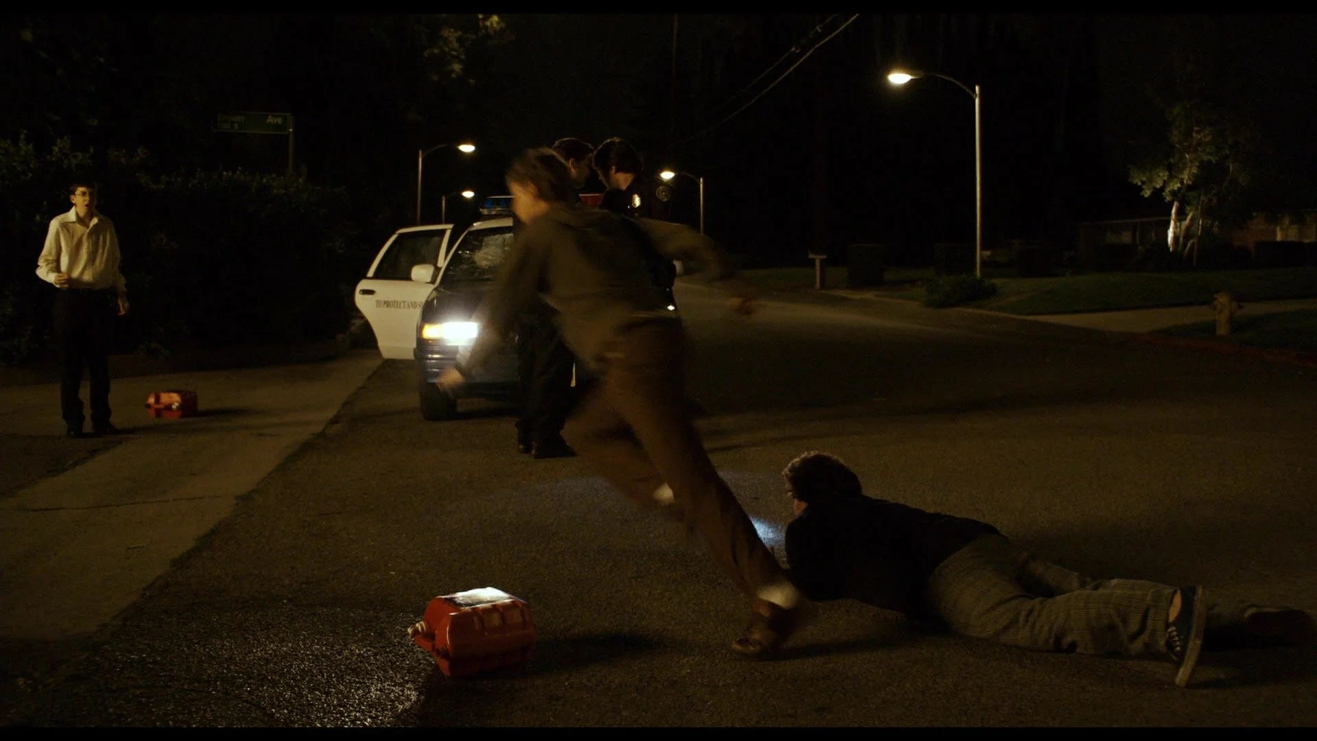 Finally, these two stories converge when the cops, driving drunk, swerve around a corner and hit a pedestrian (who happens to be none other than Seth).