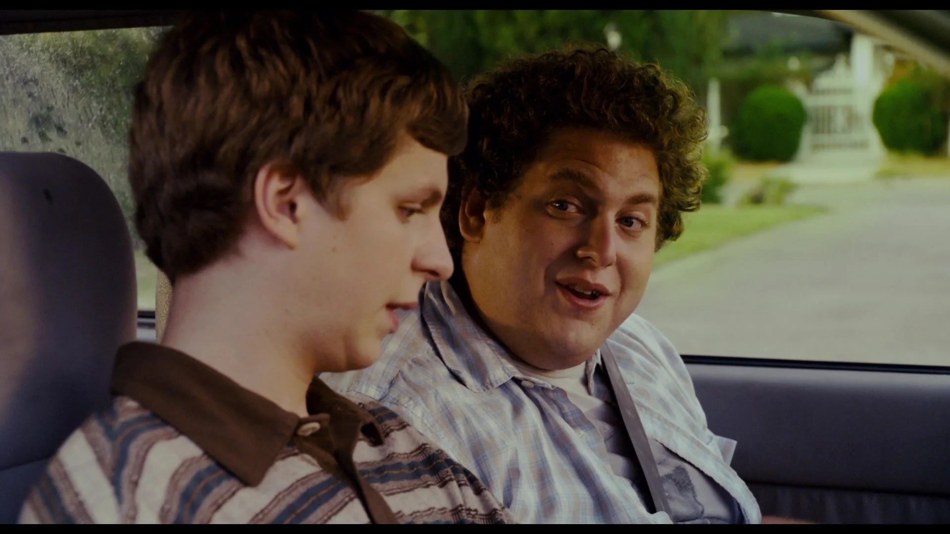 The film opens with a shot of Seth, one of our two protagonists, as he drives to pick up our other protagonist, Evan, for school. Their early-morning phone conversation about which porn-site is going to be the wisest investment, along with their lame respective morning routines, informs us right away all we need to know about these guys: they are losers.