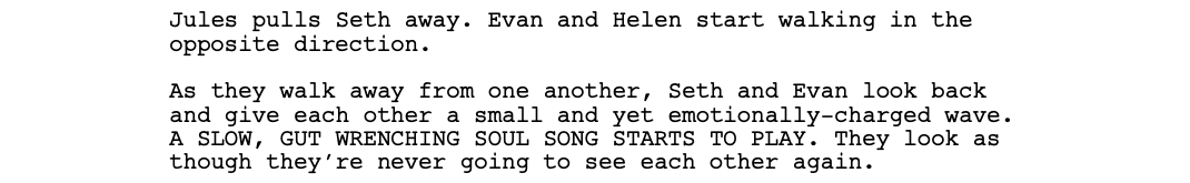 And not only is everybody forgiven, but the girls are each willing to give the boys another shot. Evan and Helen go one way, and Seth and Jules go the other. The inseparable, codependent losers have finally been able to detach from one another and spend some time with the other sex. As the two groups walk away, for a brief moment, Seth and Evan both turn around to wave each other goodbye.