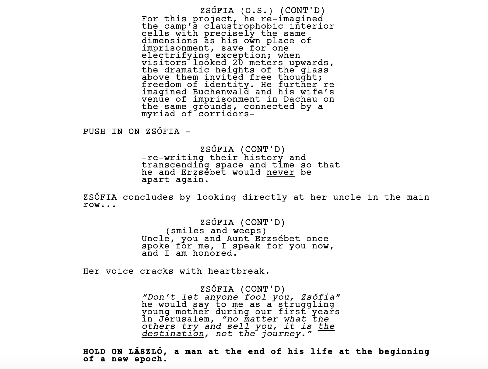 Also, for those of you who have already seen the film or read the script, you’ll notice that The Brutalist does not follow the traditional 3-act structure. Instead, the film is broken into two very distinct parts, as well as an overture and an epilogue. For that reason, this script is going to be broken down slightly differently than past analyses on the Kinolime Blog.