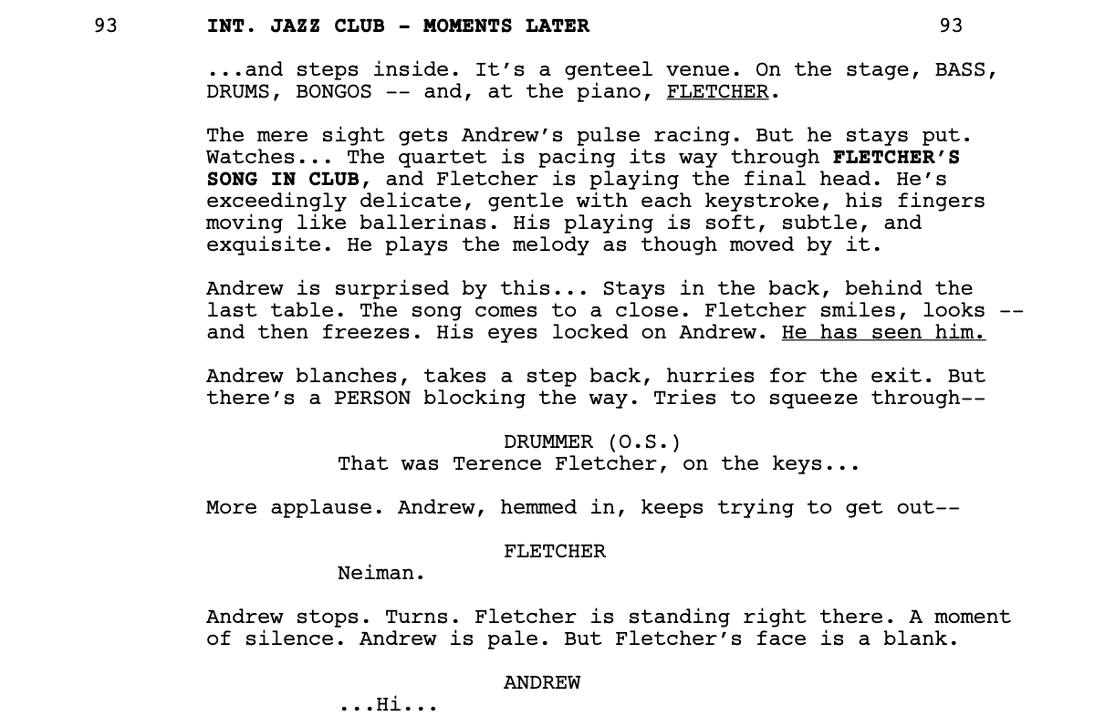 Bored one night, Andrew takes a walk to grab some pizza and stumbles across a small jazz club. The sign outside says “Featuring guest performer, Terence Fletcher”. He steps inside.