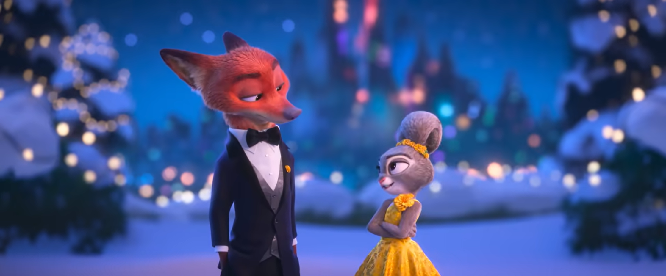 After the montage, new images come in: They walk out with the first film’s villain, Dawn Bellwether, in custody; Nick joins the police force; Judy gifts Nick the carrot recorder pen from the first film, a sign of their friendship; and finally, Judy and Nick finding themselves in the limelight, where Nick looks the slightest bit uncomfortable, while Judy looks proud and ready to seize the day.