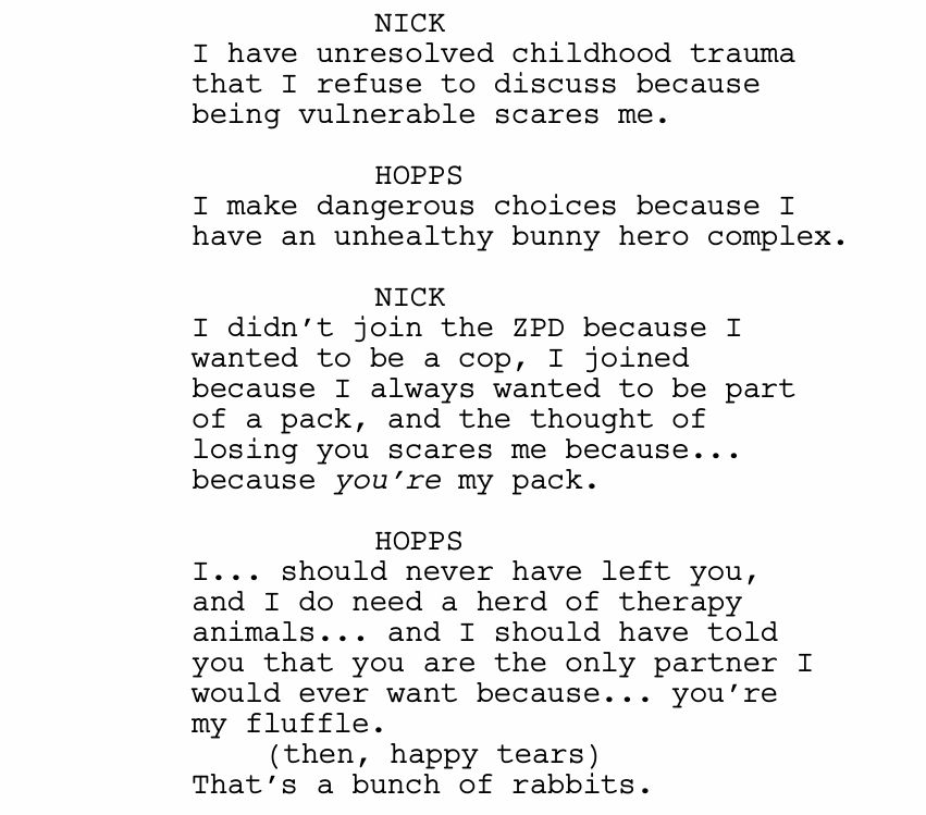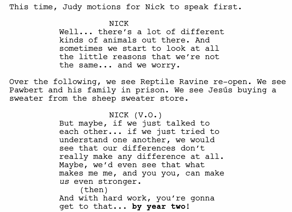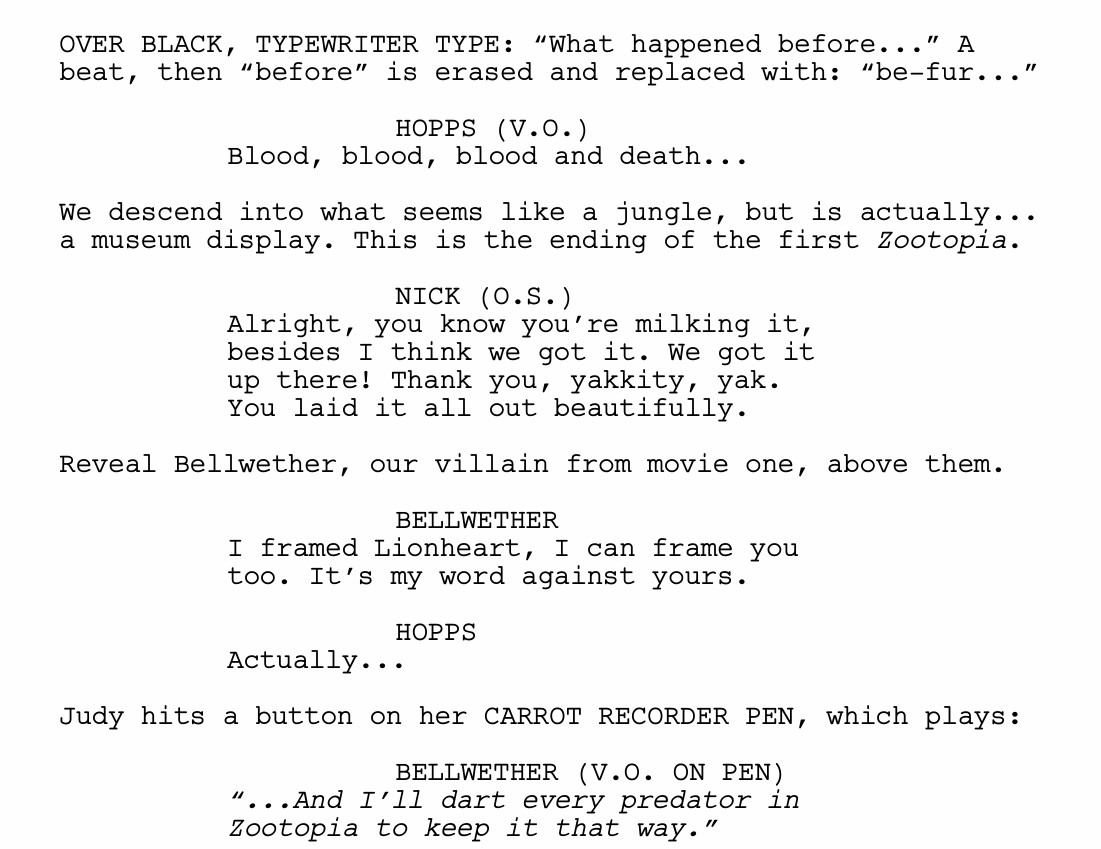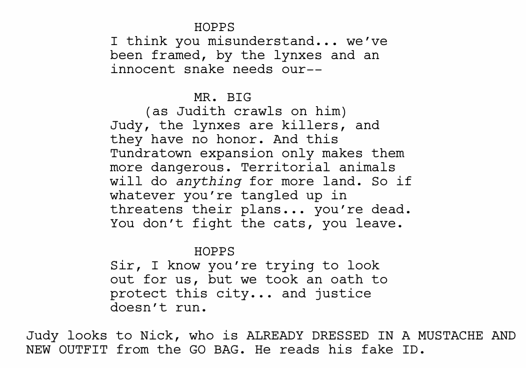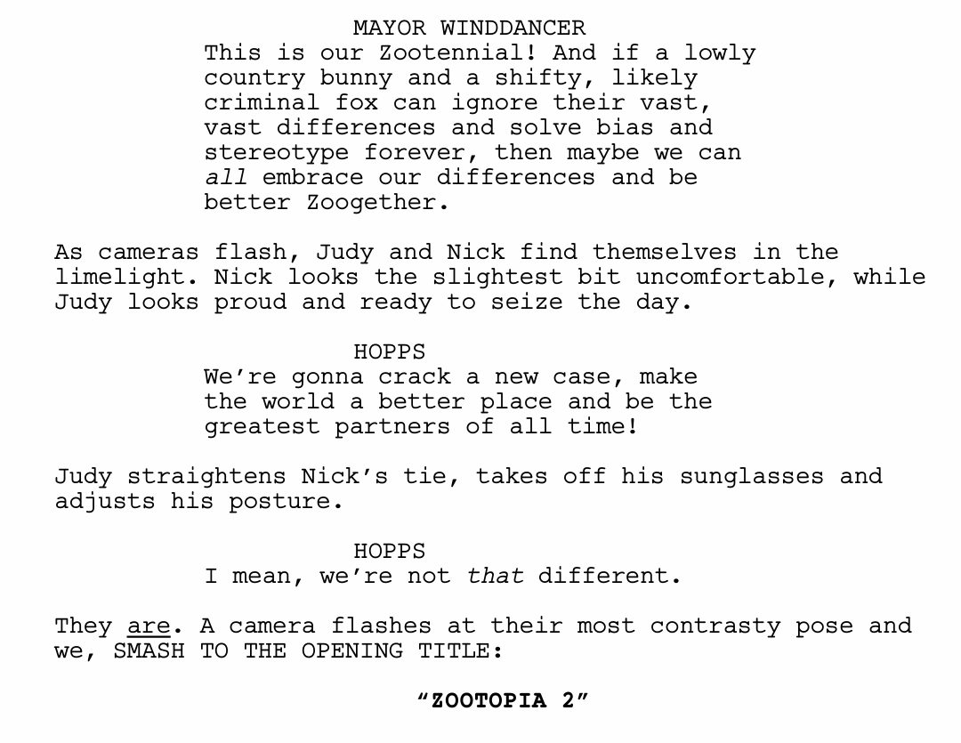 Interestingly, although Zootopia’s world has long been praised for its complexity and depth, the storytelling structures of the Zootopia films are always quite striaghtforward. In fact, in the first film, all the beats occur exactly where a screenwriter would expect. What happens at the twists, however, tends to come as a complete surprise.
