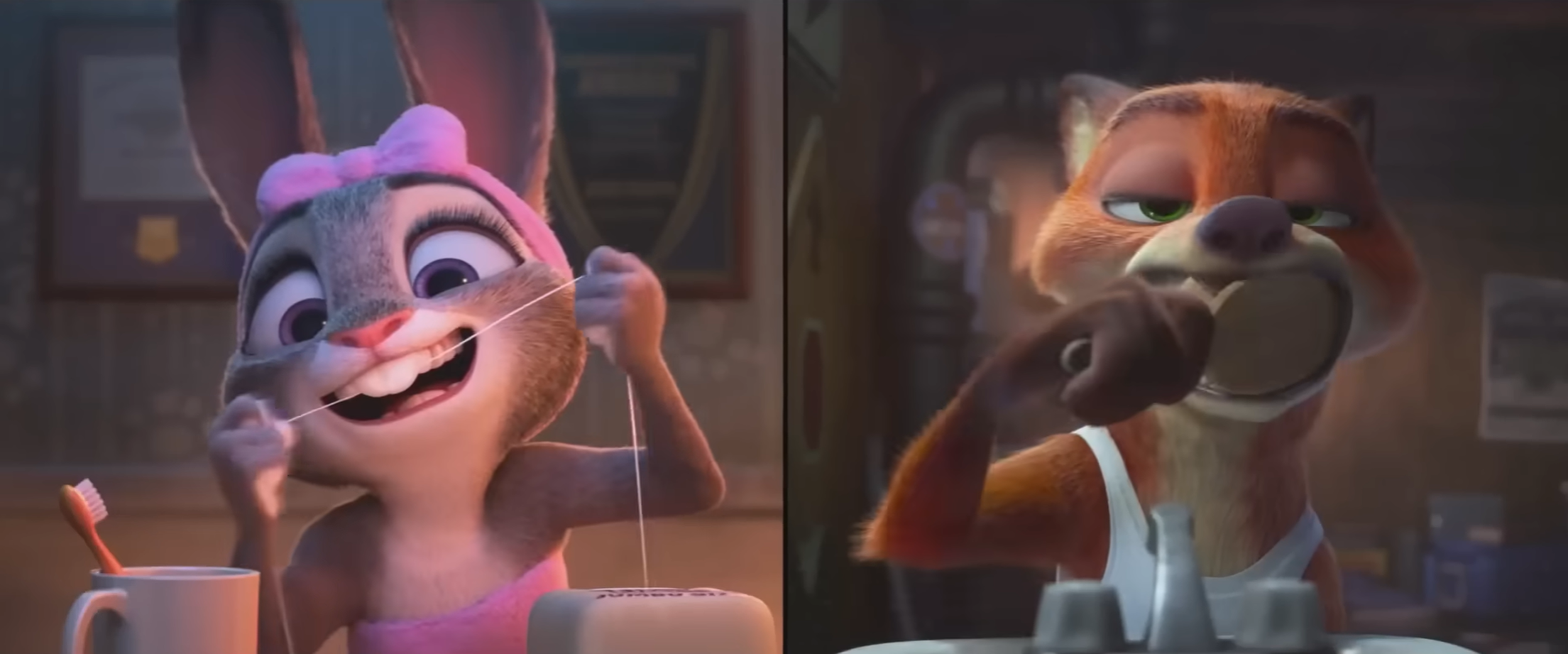 Judy and Nick get ready for their mornings. When they grab different things as they exit, the film hints at their fundamental difference. Judy grabs her badge, symbolizing her ideals of justice, while Nick grabs his carrot pen, symbolizing that his fight is for his connection with Judy.