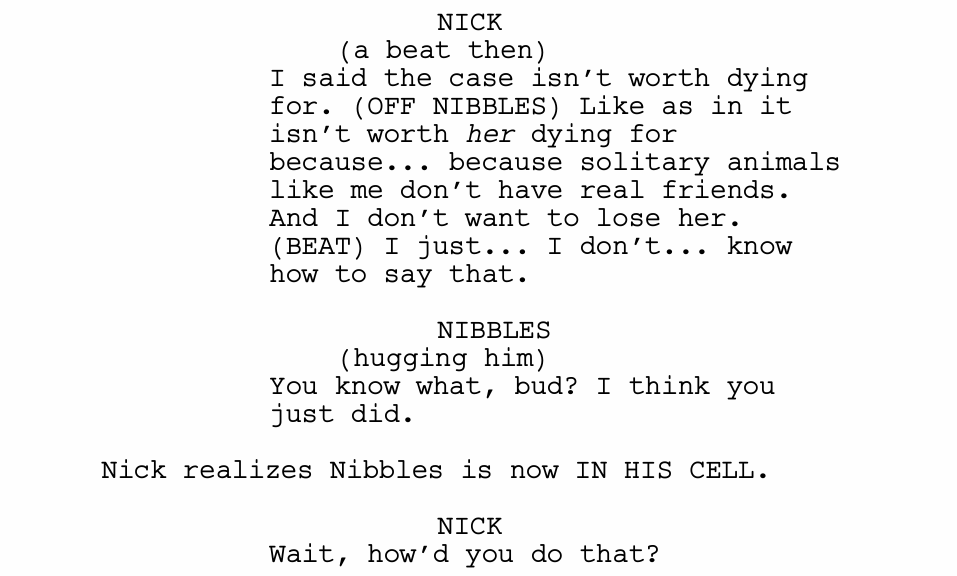 Meanwhile, Nick and Nibbles, both locked up in jail, have a heart to heart. Nick reveals his fear of losing Judy.
