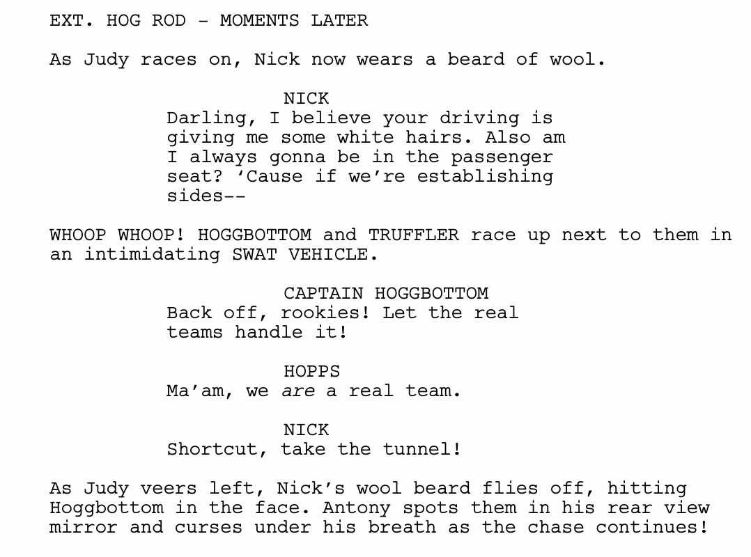 Chief Bogo arrives, infuriated at Judy and Nick for acting on their own accord. Judy, shouting her token “Stop in the name of the law!”, jumps into a wild car chase after Antony. Nick, in her passenger seat, jokingly asks Judy to consult him the next time she makes a decision like this. Judy is not listening.