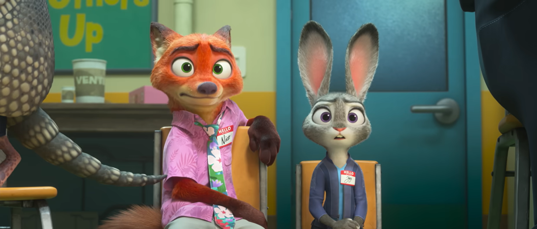 Nick does what he does best: pulling a good-father act, which convinces the anteater smuggler, Antony, to sign his child’s cast, while Judy tries to infiltrate a large cargo container. His “child” is, like in the first film, played by his friend Finnick.