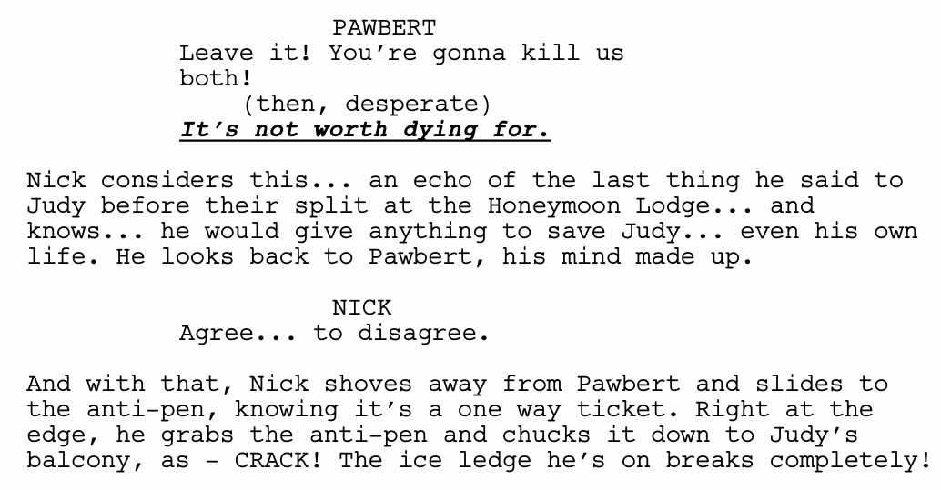 At the Honeymoon lodge, Judy and Nick finally find out the truth: reptiles used to be a huge part of Zootopia, but the lynxes have erased their neighborhood from the map. The ZPD catches up, and, in a moment of panic, Nick tells Judy that he doesn’t care about the case; he doesn’t think it’s worth dying for.