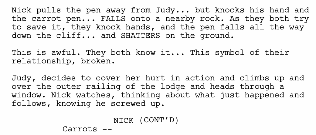 After barely escaping the water tube alive, Judy and Nick have their first big fight. Judy is leading without Nick’s consent, often putting them in dangerous situations, while Nick does not care enough about the case to support her. The fight escalates during their climb to the Honeymoon lodge, where Judy believes holds their next clue. The carrot pen, which has symbolized their relationship since the first film, falls off the cliff and breaks.